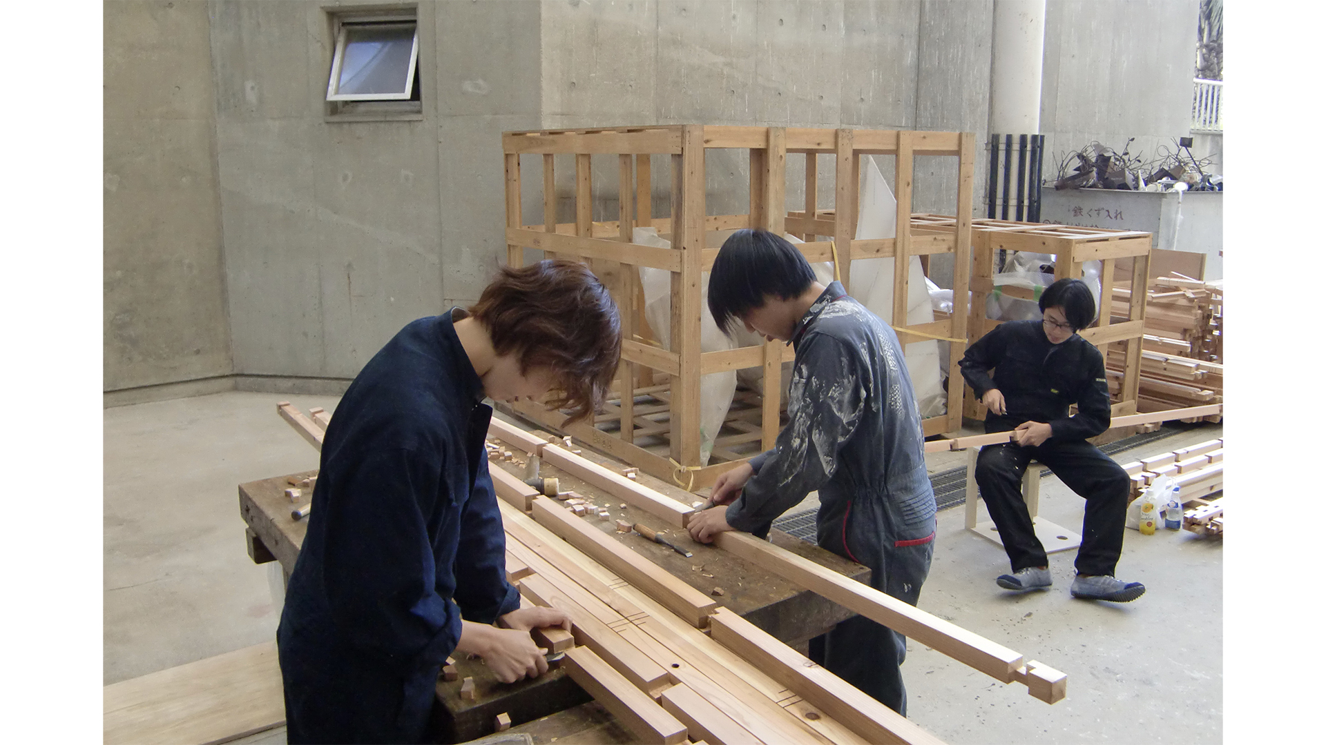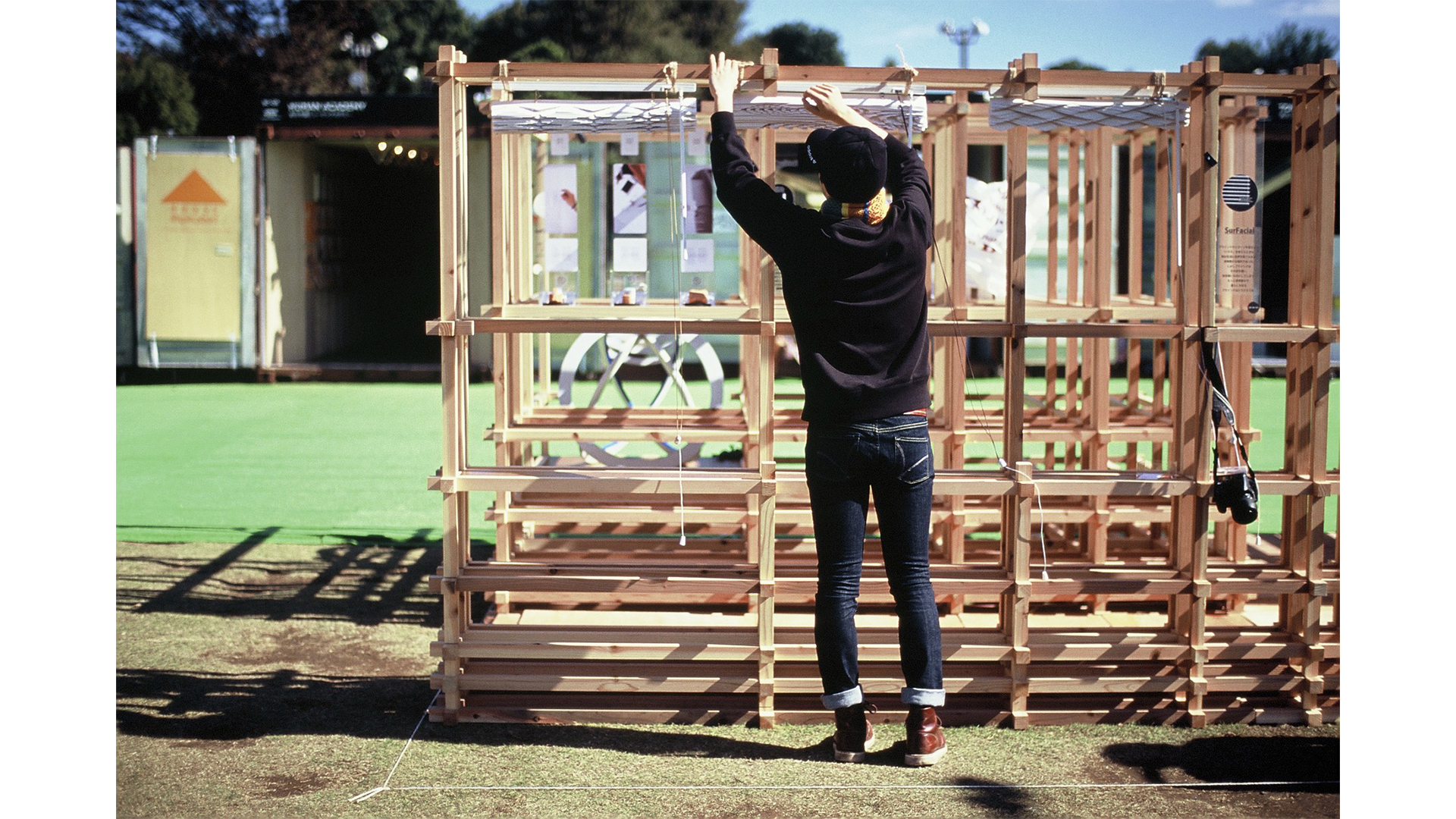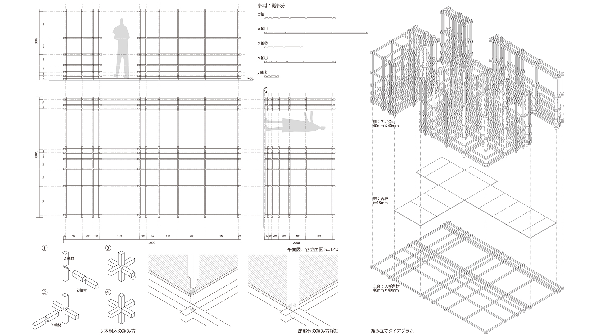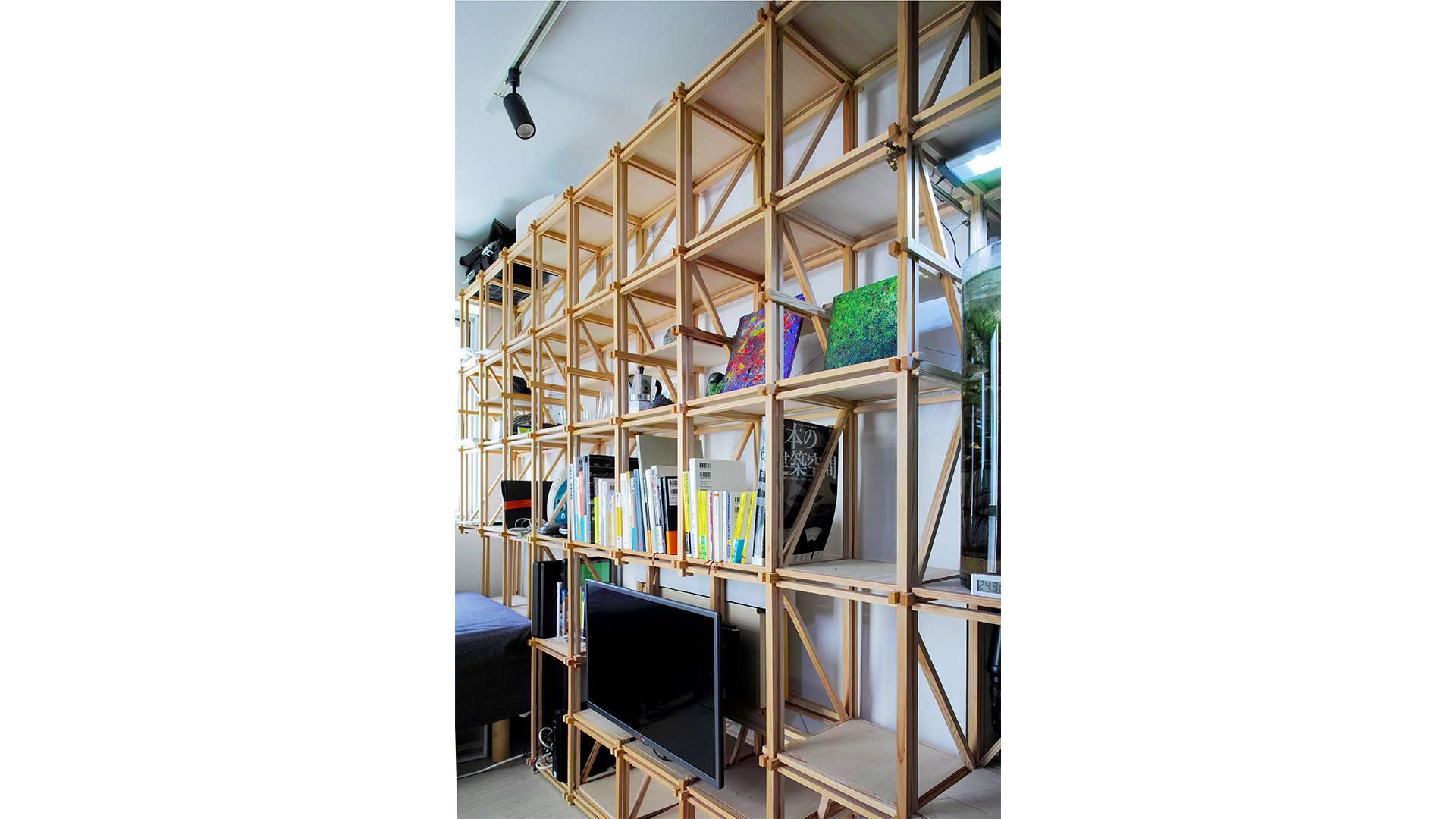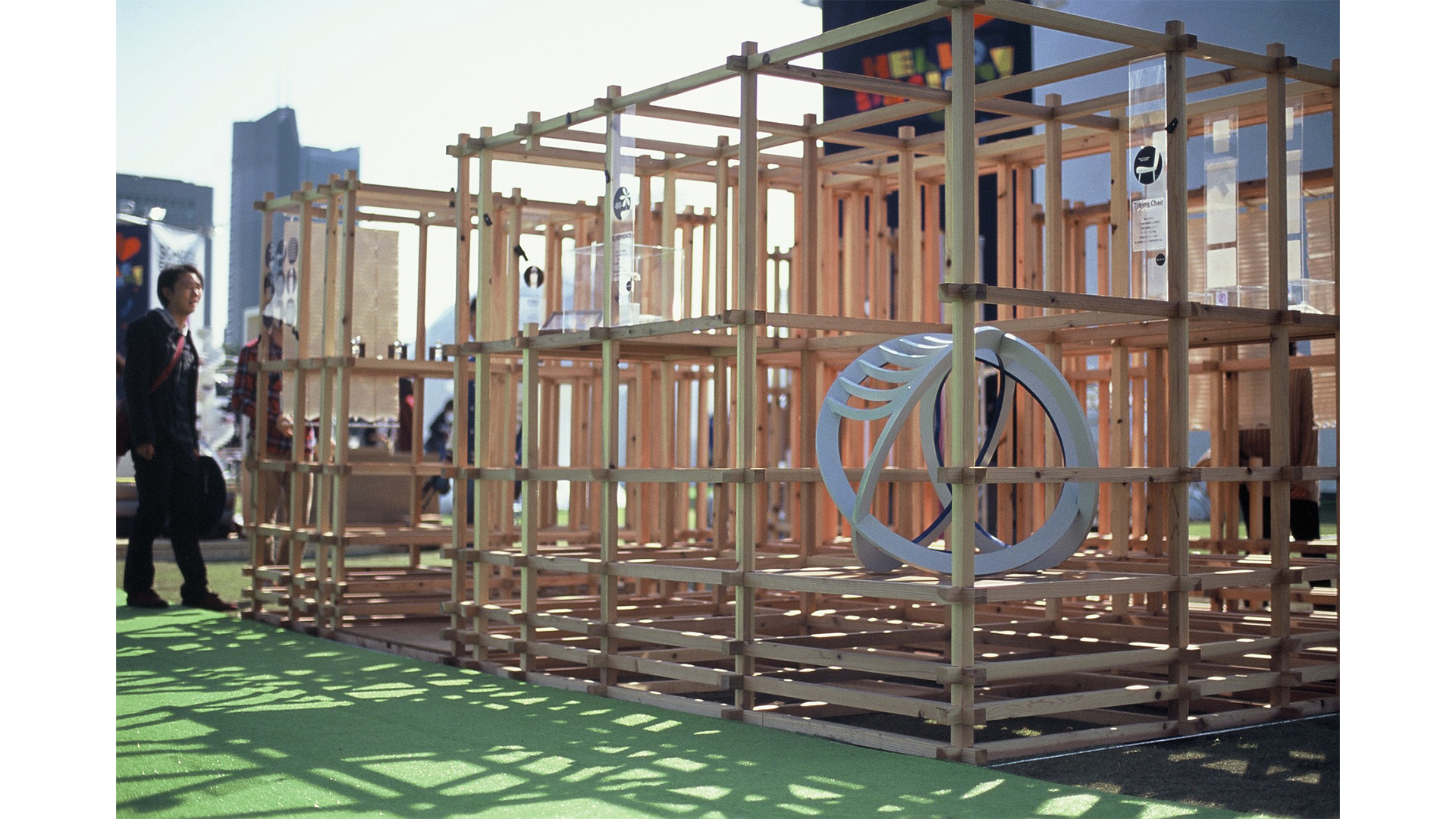 Tokyo Designer’ s Week2013 出展 TDW2013における大学の展示ブースの設計、製作をしました。 展示作品は大きさも見せ方もバラバラだったため、ブースとしての一体感を持たせつつ、同時に様々な受け皿をもつ棚をつくりました。 釘などの金物はいっさい使わずに、3本組木という木組みで全体を構成しています。
