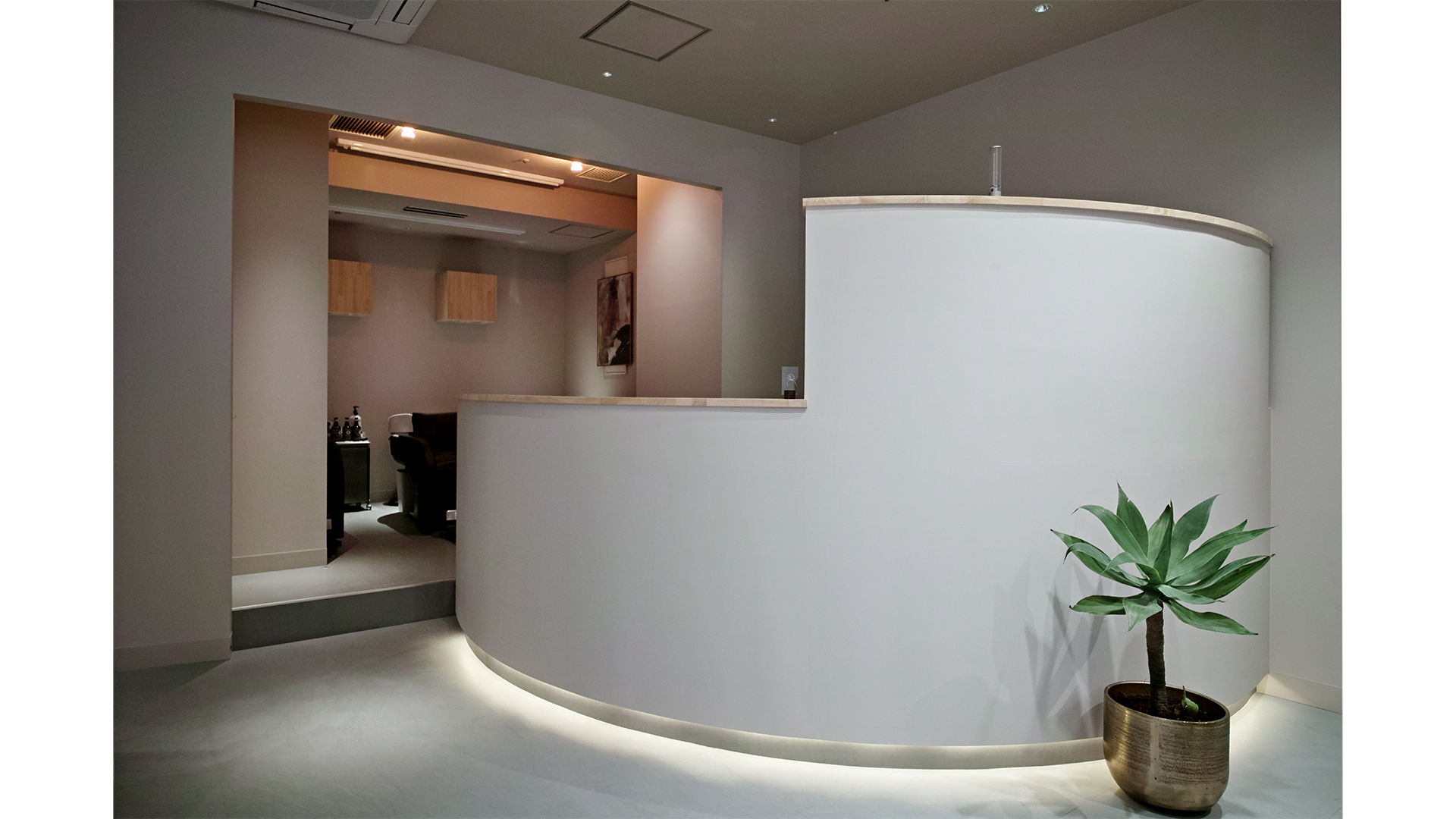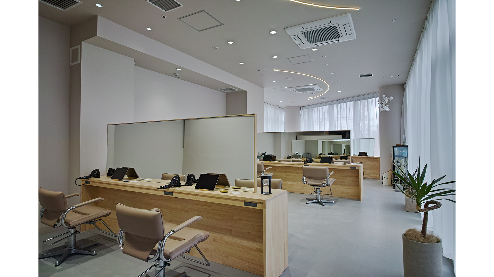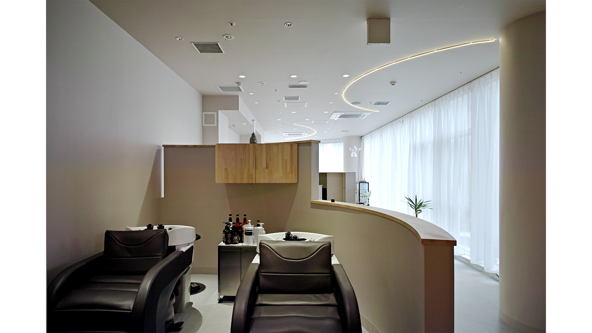 福岡市平尾の駅ビルに移転した美容室の内装計画です。 要求されたのはカット11席とシャンプー5席、十分な施術スペースとその他作業空間で、配置するだけで空間を使い切ってしまうほど、スペースに余裕はありませんでした。そこで我々は、それらの境界面を操作することで豊かな空間を作り出せないかを考えることにしました。結果として二つの円弧の壁でバックヤードとシャンプースペースを包み込み、残りのスペースを施術空間とする計画となりました。 円弧の一つはバックヤードを隠蔽するとともに、奥の空間に至るまでの緩急のある動線を演出しています。もう一つはシャンプースペースを親密な雰囲気にするとともに、彫刻的なパーティションとして、施術空間にアクセントを加えています。円弧は他にも天井面や家具に分散して登場し、限られたスペースの中で自由に空間を彩っています。 外周の大半を占めるガラス面にはレースカーテンをかけることにしました。時間帯と天気によって内外に明暗差が生じ、昼は室内から街の賑わいを眺め、夜は街路へ働いている様子を発信する、内外の関係を取り持つインターフェイスとしています。 境界面を少し曲げてみる。内外の境界を半透明にしてみる。そうすることで、硬化した空間に緩みと遊びが生まれ、肩の力の抜けた気持ちの良い空間となればと思います。