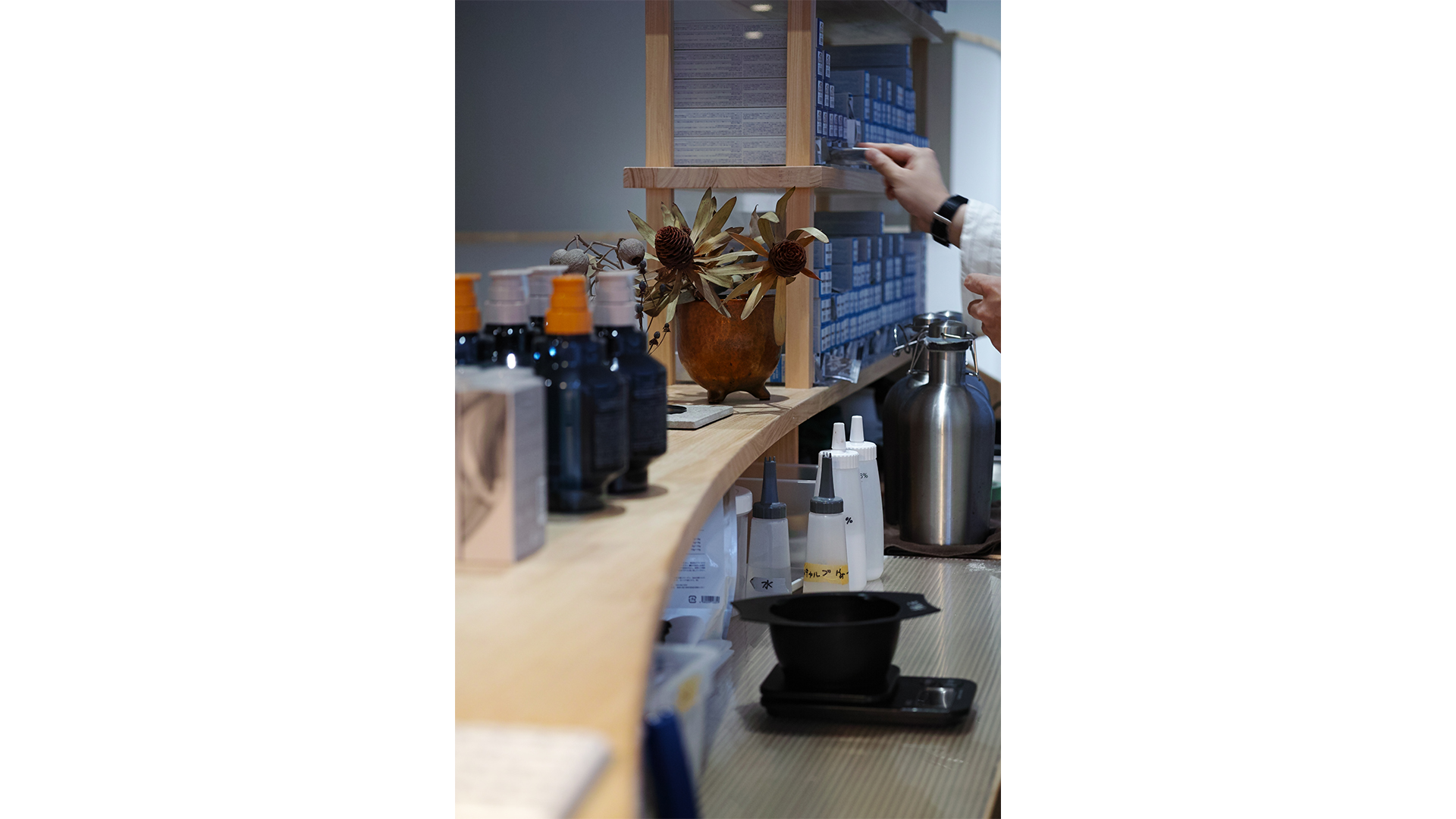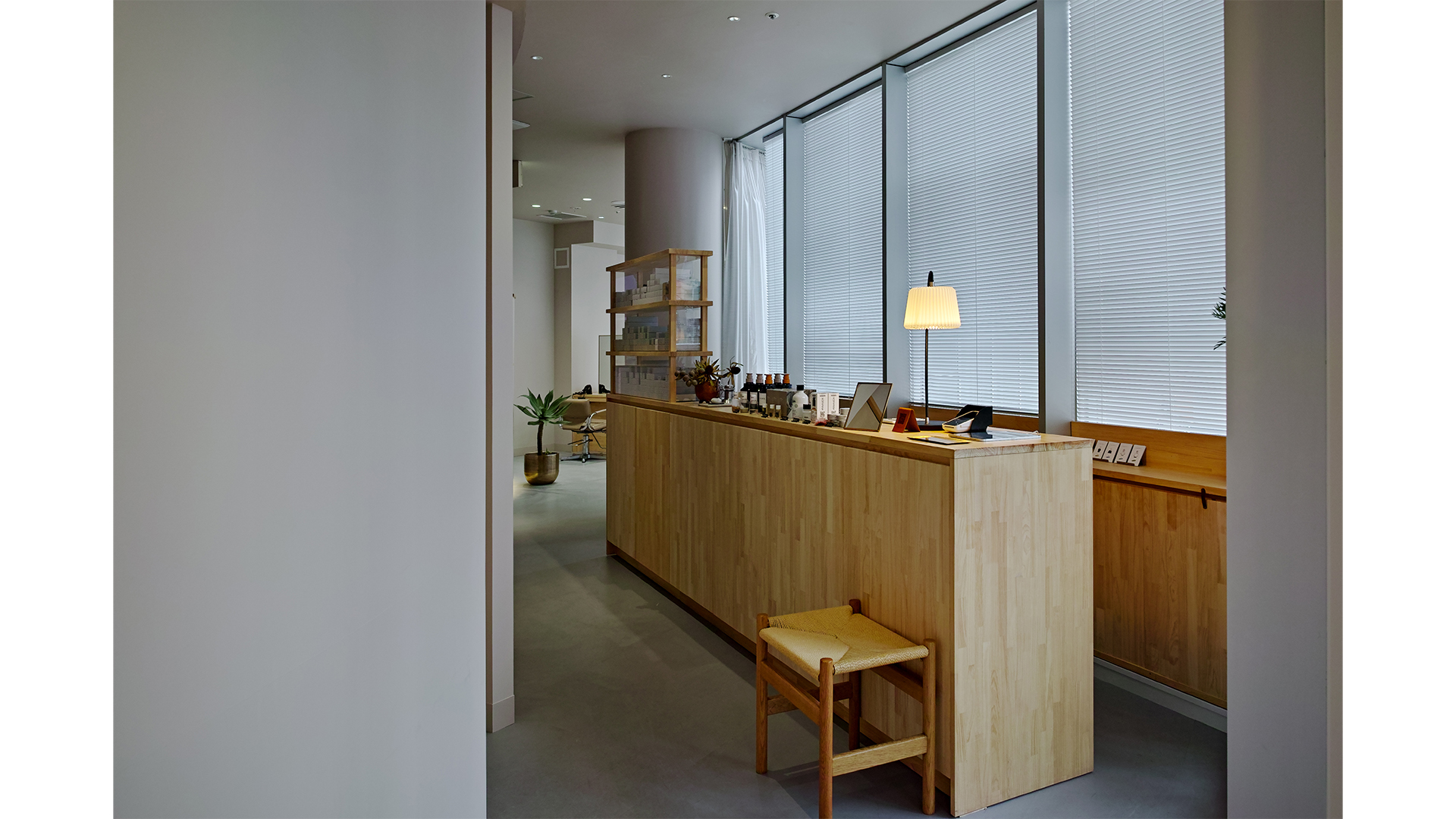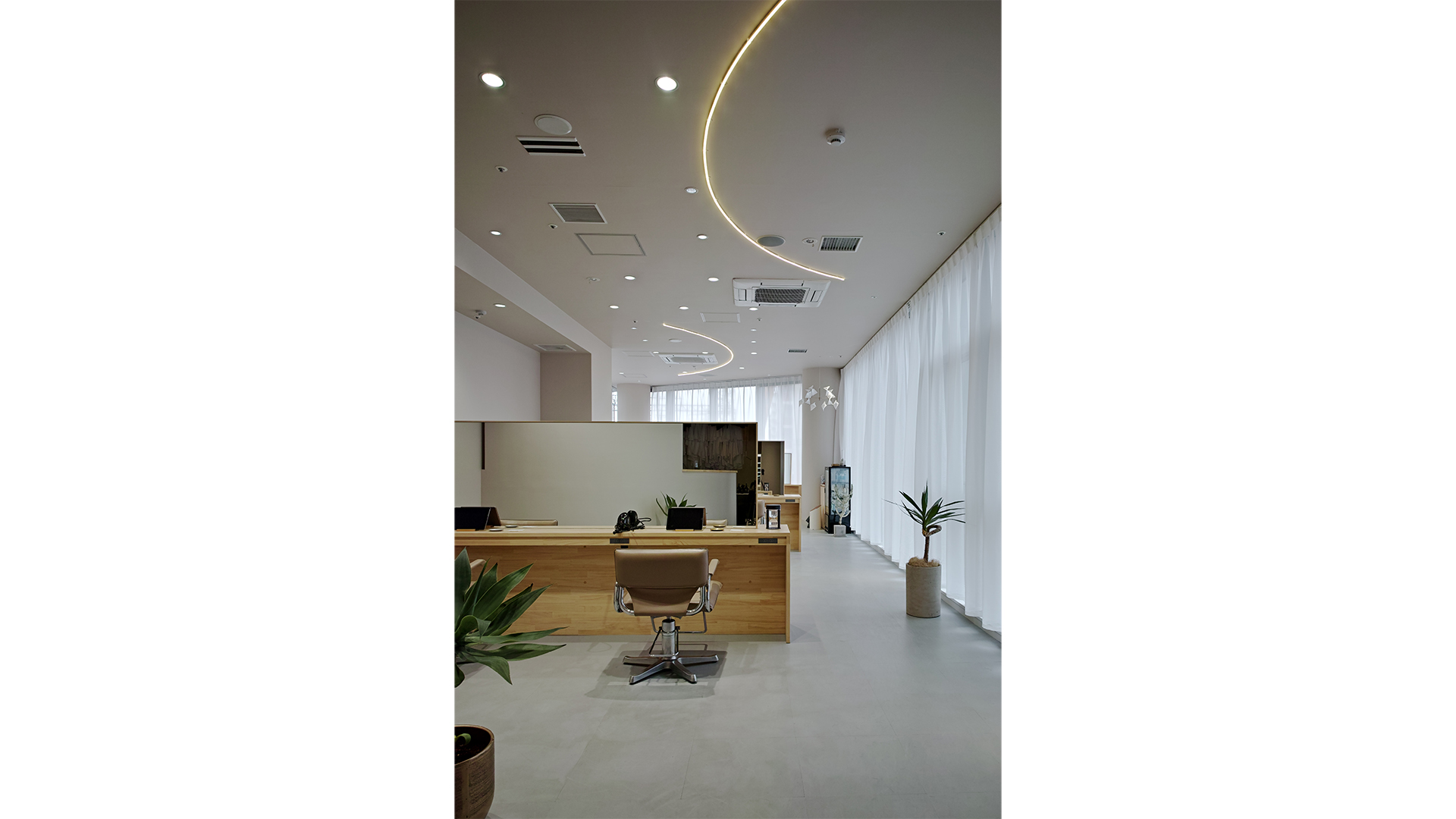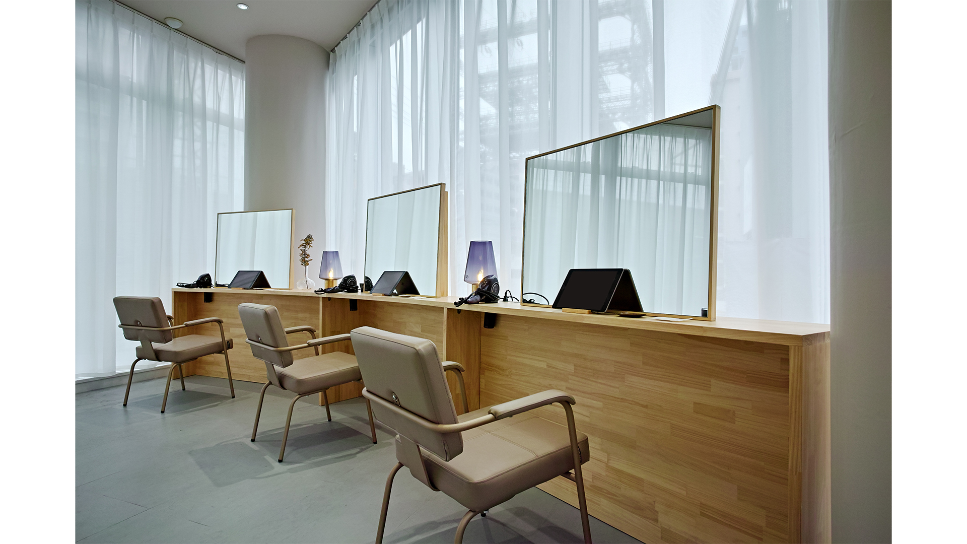 福岡市平尾の駅ビルに移転した美容室の内装計画です。 要求されたのはカット11席とシャンプー5席、十分な施術スペースとその他作業空間で、配置するだけで空間を使い切ってしまうほど、スペースに余裕はありませんでした。そこで我々は、それらの境界面を操作することで豊かな空間を作り出せないかを考えることにしました。結果として二つの円弧の壁でバックヤードとシャンプースペースを包み込み、残りのスペースを施術空間とする計画となりました。 円弧の一つはバックヤードを隠蔽するとともに、奥の空間に至るまでの緩急のある動線を演出しています。もう一つはシャンプースペースを親密な雰囲気にするとともに、彫刻的なパーティションとして、施術空間にアクセントを加えています。円弧は他にも天井面や家具に分散して登場し、限られたスペースの中で自由に空間を彩っています。 外周の大半を占めるガラス面にはレースカーテンをかけることにしました。時間帯と天気によって内外に明暗差が生じ、昼は室内から街の賑わいを眺め、夜は街路へ働いている様子を発信する、内外の関係を取り持つインターフェイスとしています。 境界面を少し曲げてみる。内外の境界を半透明にしてみる。そうすることで、硬化した空間に緩みと遊びが生まれ、肩の力の抜けた気持ちの良い空間となればと思います。