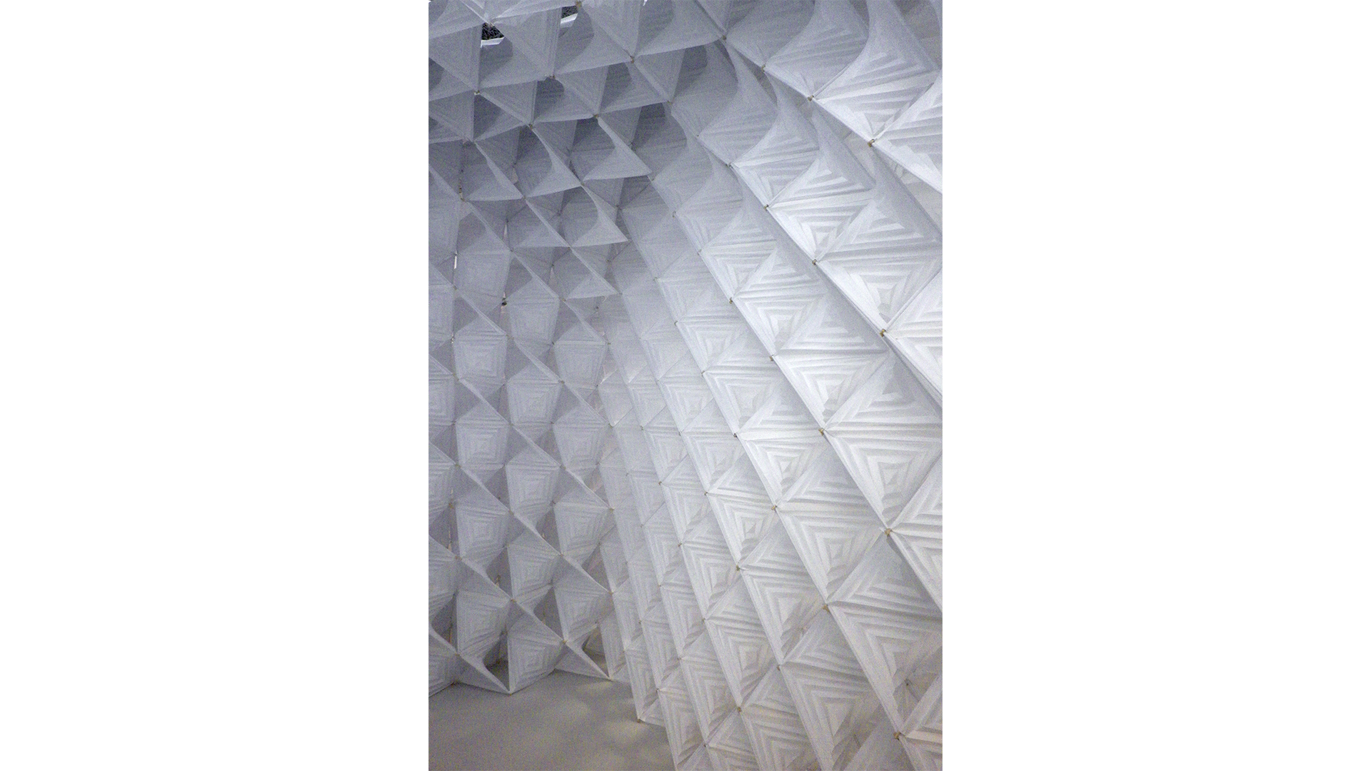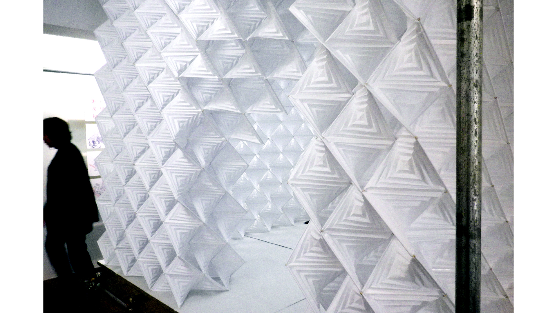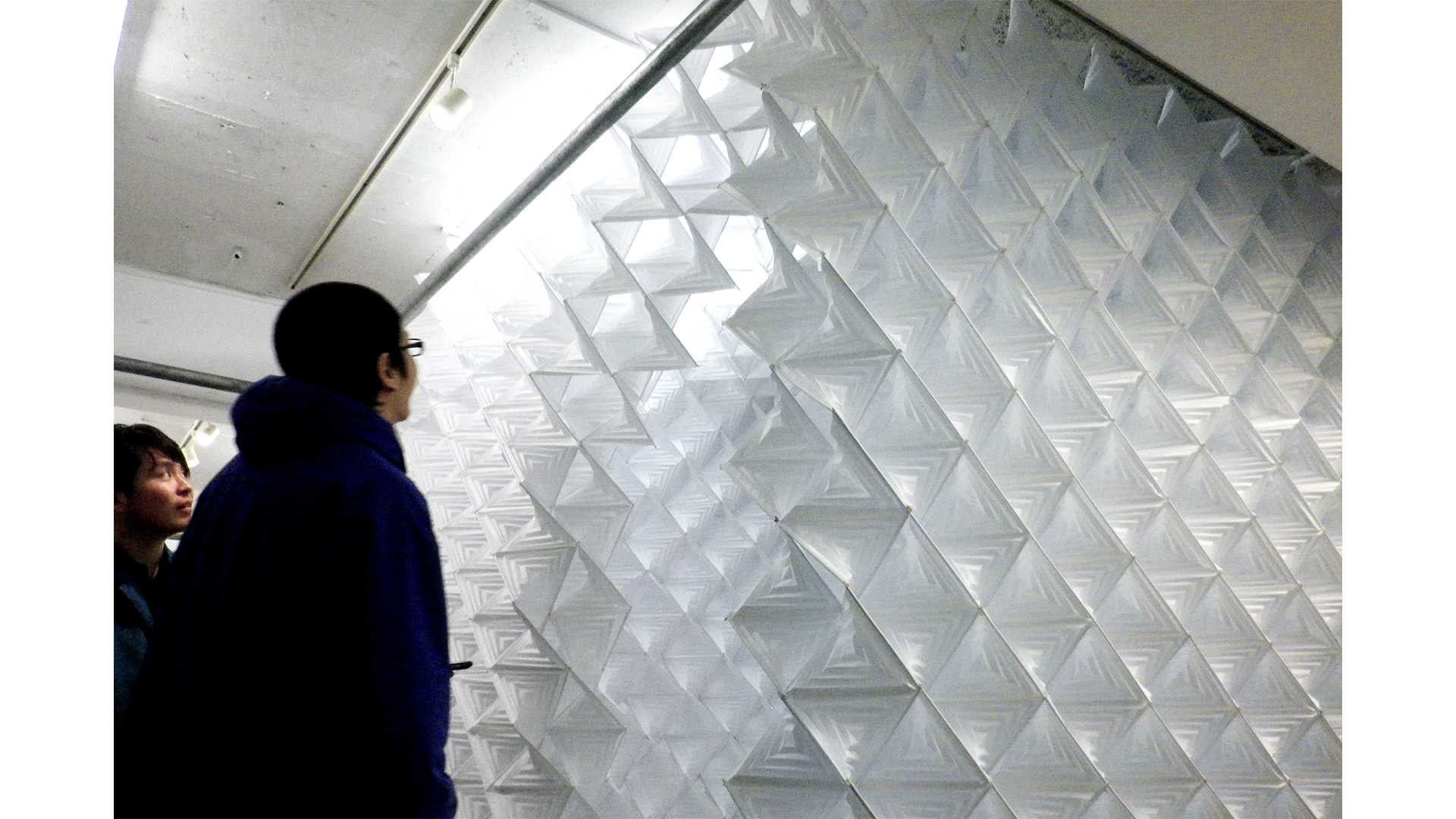 茶室コンペ2013 入賞(4選) アーキニアリングデザイン展2013 出展 茶室とは、出来るだけ簡素な材料で、かつ最小限の大きさでありながらも、最大限の空間的な豊かさを実現するものだと考えました。そういった茶室のあり方の解釈をもとに、現代における茶室建築を再考しました。 材料には私たちの身近にあるコピー用紙を使い、折り紙という日本古来の伝統的な技法を用いて空間をつくり出します。 茶室コンペ最終審査では、実際に1/1のスケールで組み上げることに挑戦しました。